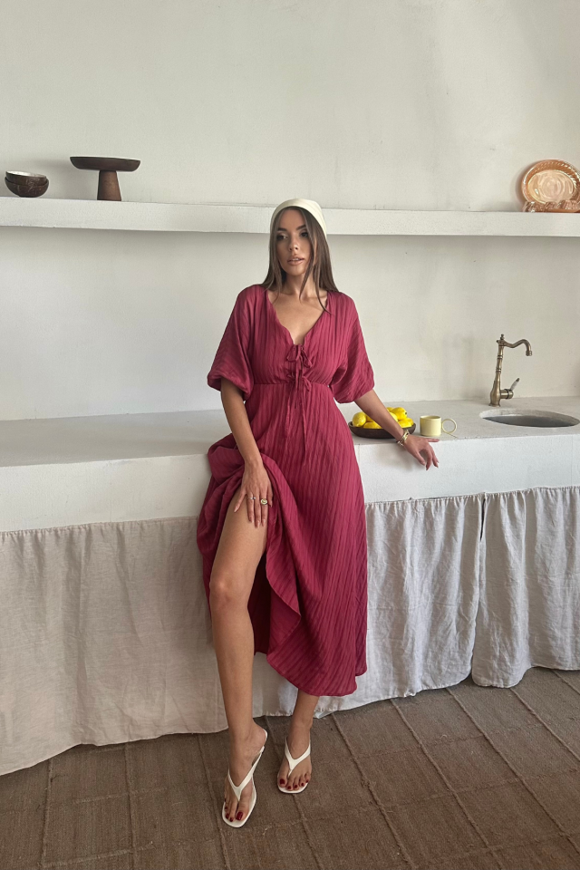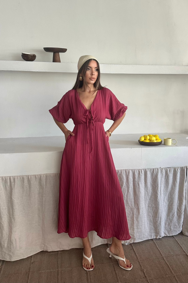 V YAKA DÖKÜMLÜ ELBİSE - Pembe