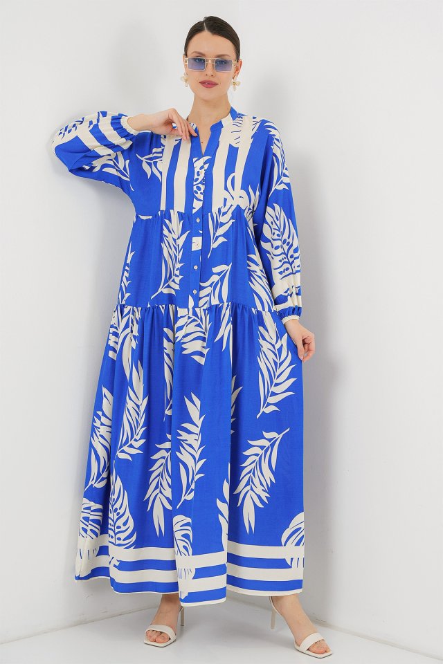2423 Otantik Desenli Tesettür Elbise - Saks 3