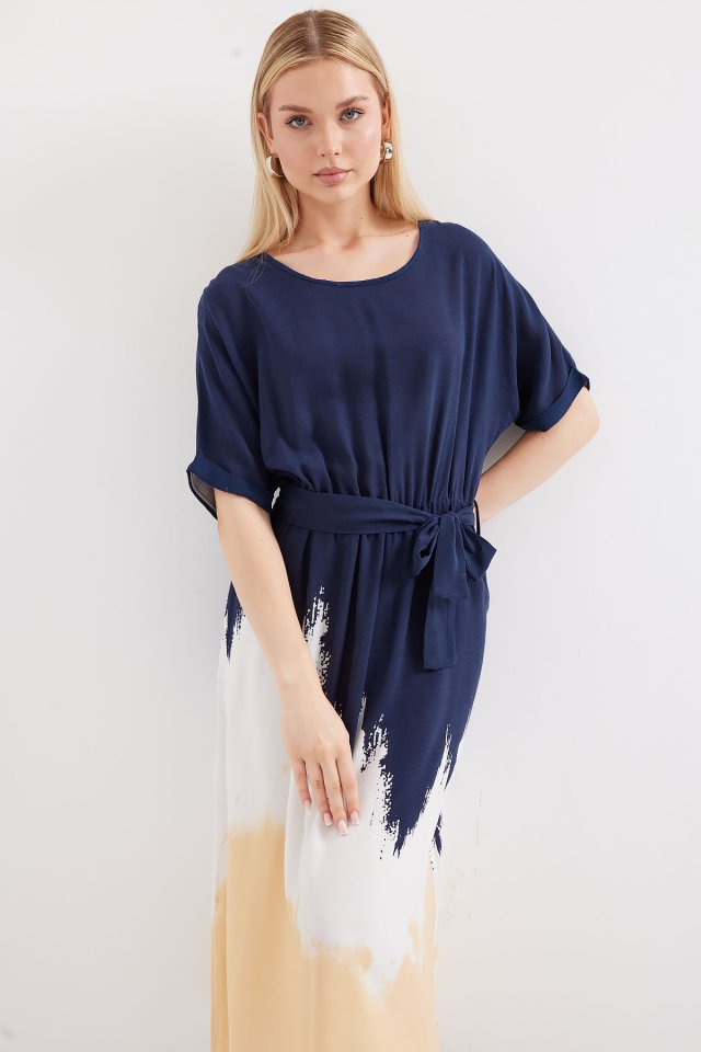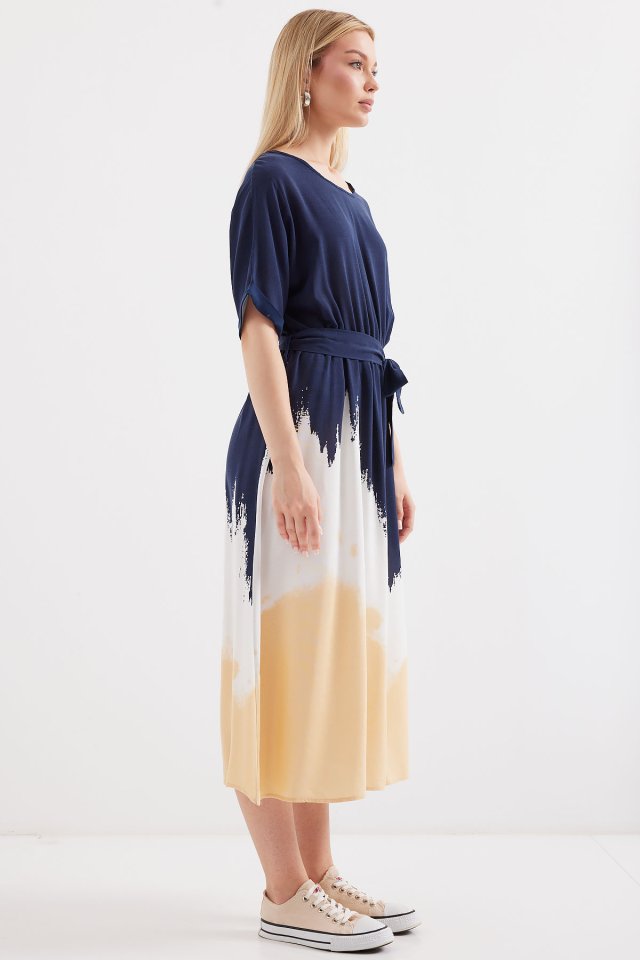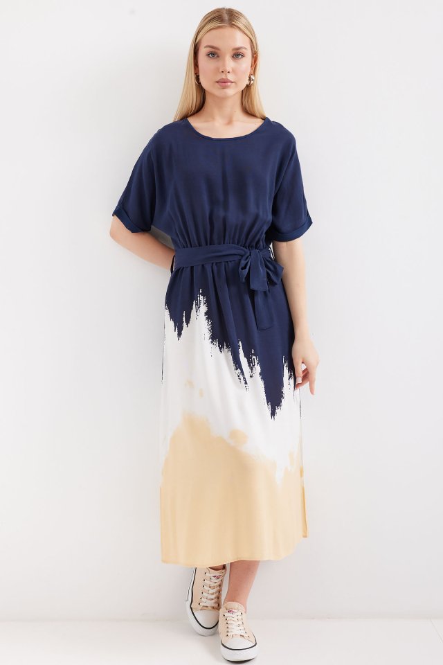 2504 Desenli Kısa Kol Viskon Elbise - Lacivert