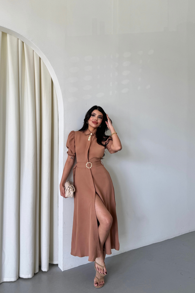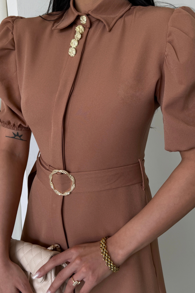 YAKA DÜĞME DETAYLI ELBİSE - Kahverengi